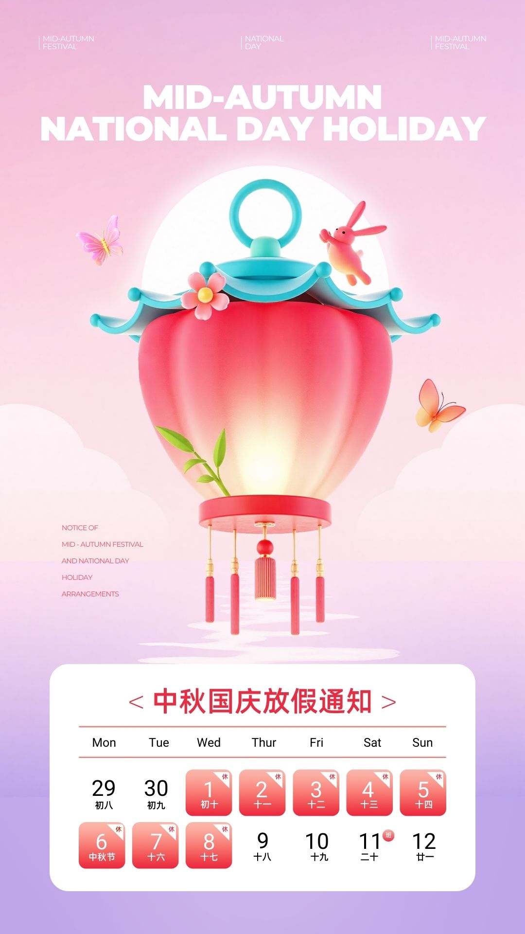 Nous célébrons la double fête annuelle de Fête de la mi-automne et fête nationale! Chunxin vous présente ses vœux les plus sincères et sa gratitude.
